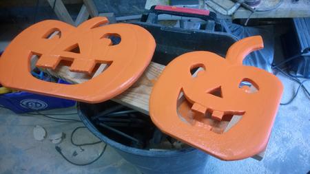 We used some scrap pieces of 1 x4 and 1x6 pine. We glued and pressed them together with pipe clamps to create a single board large enough for our Halloween pumpkin design.