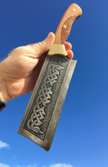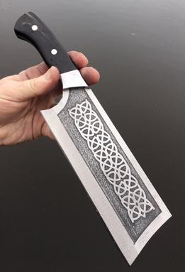 This custom made cleaver is deeply etched with a Celtic blade design, Rope spine etching and includes Walnut scales (handles) and brass bolsters and pins.