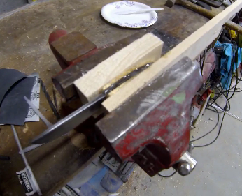 Once the rough blanks are cut one side at a time can be clamped in a vise to the knife. Drill holes through the existing mounting holes of the knife and through the handle. For this project we used 1/4 inch aluminum shafting and a 1/4 inch drill.