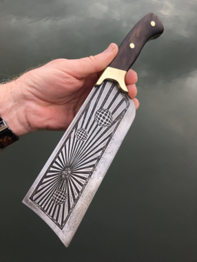 The Modified Cleaver is longer and not quite as wide as a standard cleaver. Its design not only makes it very useful in the kitchen but lends itself to a huge variety of blade etching patterns. Image above shows Modified Cleaver with Celtic blade etching and Cherry wood scales.